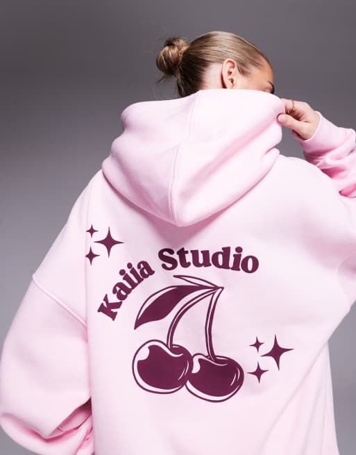 Kaiia - Studio - Sweat à capuche d'ensemble oversize mélange coton avec imprimé cerise contrasté au dos - Rose bébé