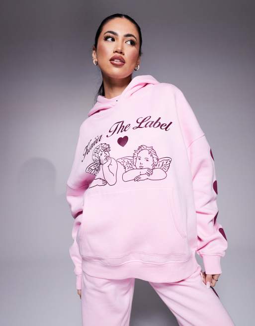 Kaiia - Sweat à capuche d'ensemble oversize en coton mélangé avec logo ange et cœur bombé - Rose et bordeaux