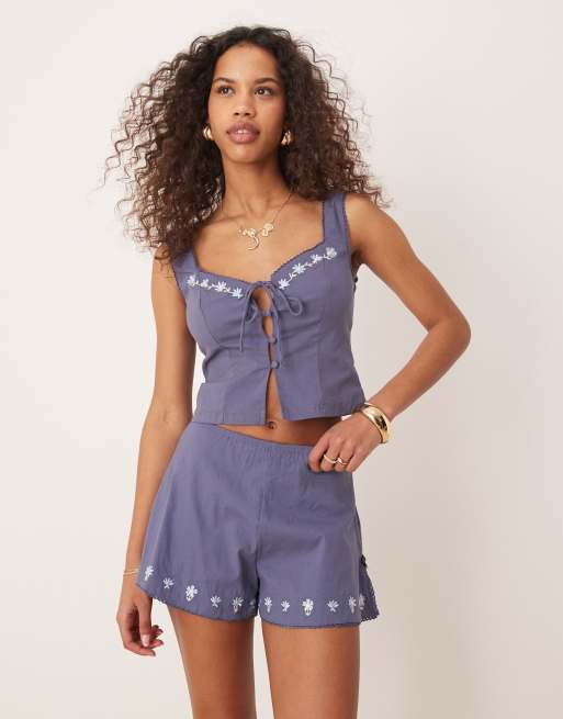Kiss The Sky - Top brodé boutonné d'ensemble noué devant - Bleu marine