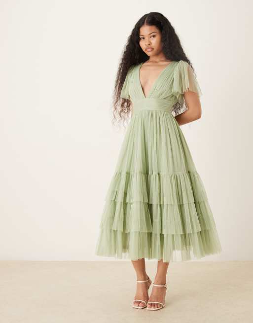 Lace & Beads Petite - Robe mi-longue pour demoiselle d'honneur en tulle à décolleté plongeant et manches évasées - Vert sauge