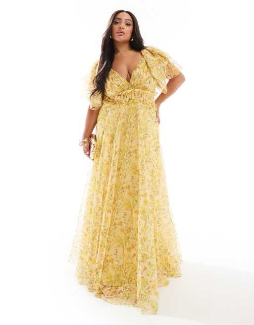 Lace & Beads Plus - Robe longue en tulle à manches évasées et volants - Jaune fleuri