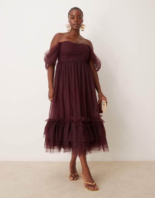 Lace & Beads Plus - Robe longueur mollet à épaules dénudées avec taille corsetée et volants - Prune