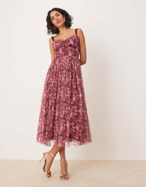 Lace & Beads - Robe corset longueur mollet en tulle à fleurs - Blush