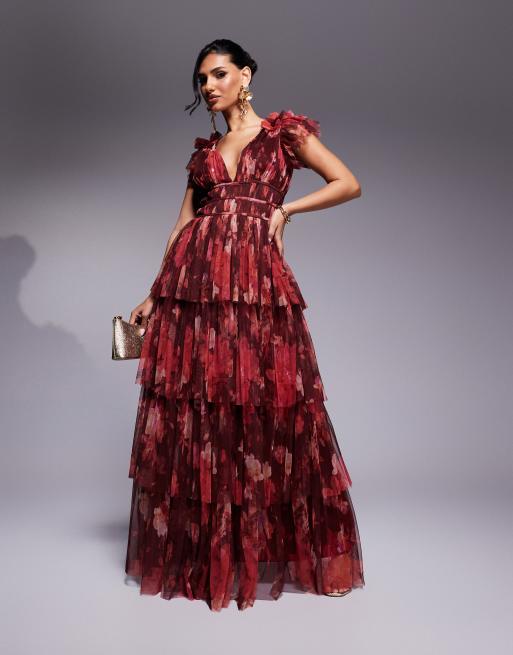 Lace & Beads - Robe longue à volants sur les épaules - Rouge rose profond