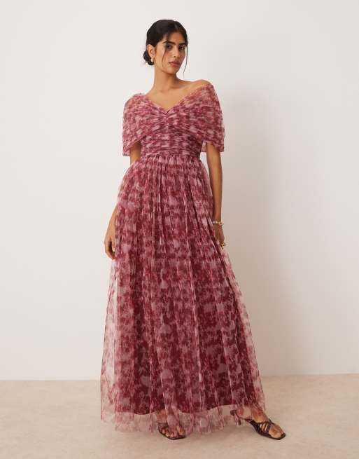 Lace & Beads - Robe longue en tulle à épaules dénudées avec nœud - Blush fleuri