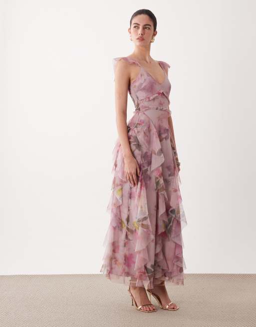 Lace & Beads - Robe longue en tulle à volants et imprimé fleuri abstrait - Rose