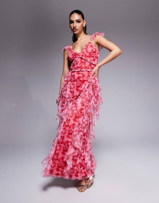 Lace & Beads - Robe longueur mollet en tulle à imprimé fleuri et volants - Rouge et rose