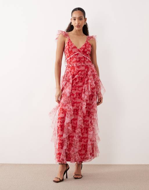 Lace & Beads - Robe longueur mollet en tulle à imprimé fleuri et volants - Rouge et rose