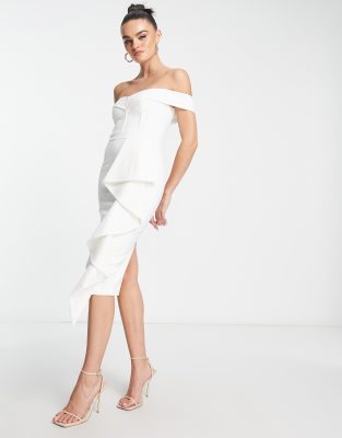 Lavish Alice - Robe mi-longue à volants et épaules dénudées - Blanc