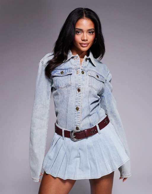 Lioness - Ensemble veste en jean avec ceinture et mini-jupe short plissées à détails cintrés - Bleu clair délavé