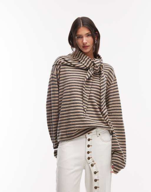 Lioness - Olsen - Pull rayé coupe carrée en laine mélangée avec manches longues et écharpe amovible - Beige/ardoise