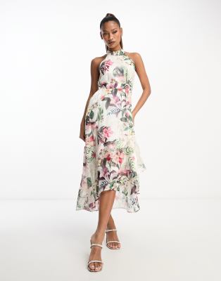 Lipsy - Robe mi-longue à imprimé fleuri avec jupe portefeuille et encolure américaine