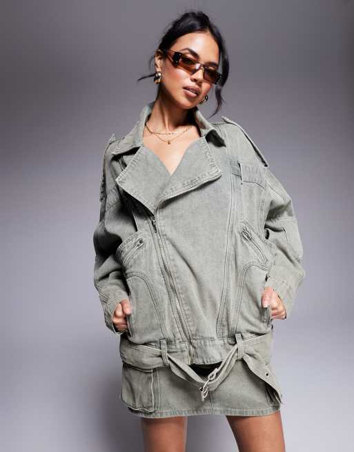 Liquor N Poker - Blouson style motard oversize en jean - Kaki délavé