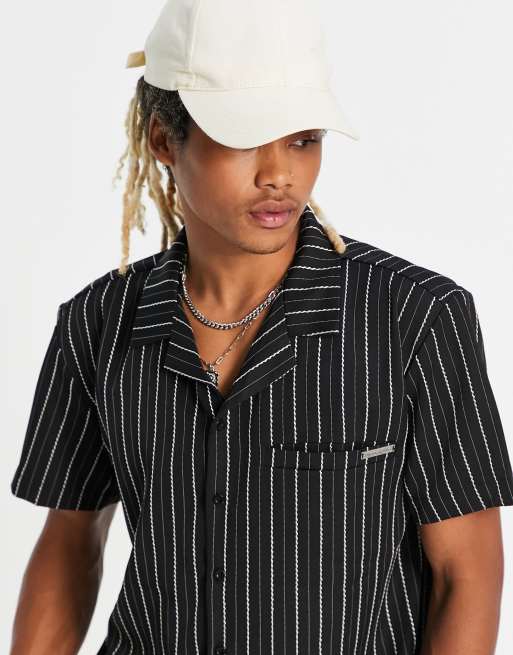 Liquor N Poker - Chemise d'ensemble à manches courtes et col à revers à rayures fines - Noir et blanc