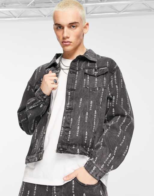 Liquor N Poker - Veste camionneur oversize d'ensemble en jean à inscription asiatique sur toute la surface - Noir