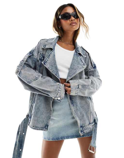 Liquor N Poker - Veste en jean délavé coupe oversize style motard - Bleu