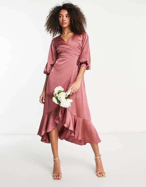 Liquorish - Robe cache-cœur mi-longue de demoiselle d'honneur à manches bouffantes en satin - Rose doux