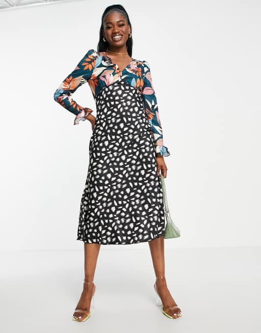 Little Mistress - Robe rétro mi-longue décolletée à l'avant avec imprimés pois et fleurs façon patchwork