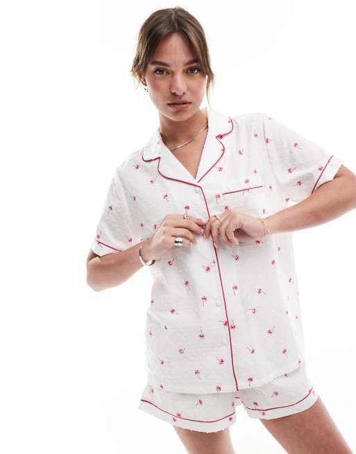 Loungeable - Chemise classique à pois imprimés avec manches courtes et short - Blanc