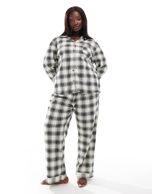 Loungeable Curve - Pyjama boutonné en polaire à carreaux et manches longues - Crème/noir