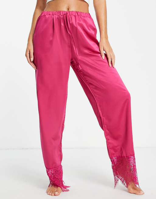 Loungeable - Pantalon de pyjama d'ensemble en satin à finitions dentelle - Framboise