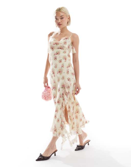 Love Triangle - Robe longue à fleurs et volants avec dos ouvert - Crème