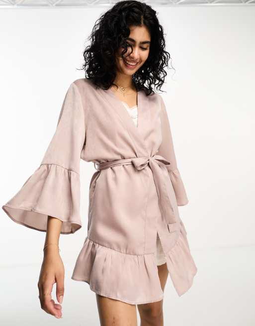 Luna - Peignoir court de demoiselle d'honneur en satin à manches volantées - Rose poudré