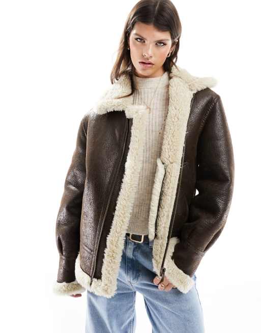 Mango - Blouson aviateur en imitation peau de mouton - Marron foncé