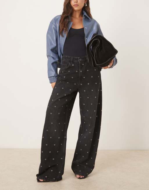 Mango - Jean droit coton avec œillets - Noir délavé