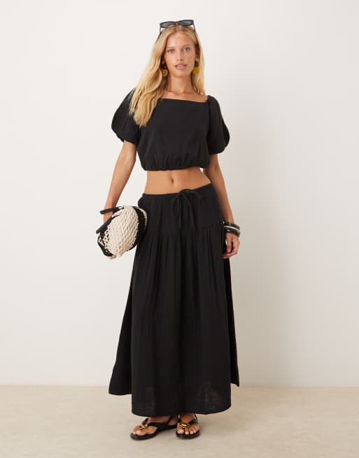Mango - Jupe mi-longue d'ensemble en crépon à cordon de serrage - Noir