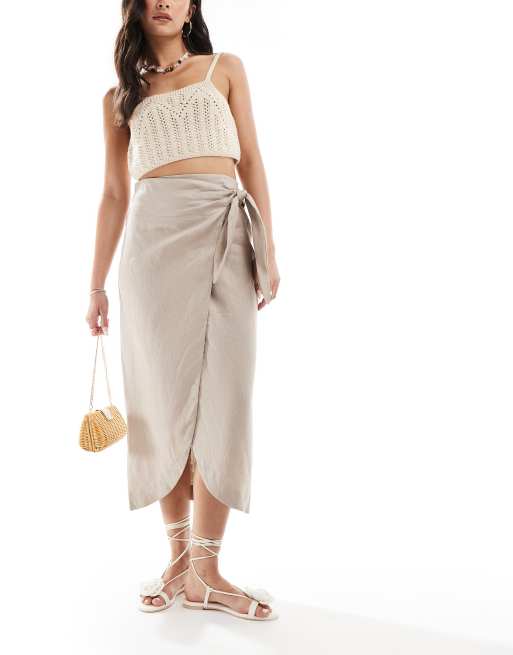 Mango - Jupe portefeuille en lin - Beige