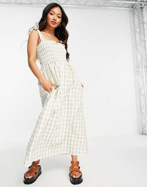Mango - Robe d'été en crépon froncé - Carreaux vichy sauge