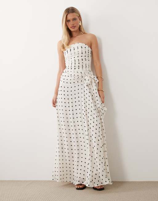 Mango - Robe longue à épaules dénudées - Crème à pois noirs