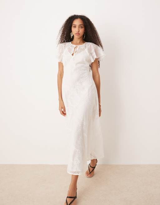 Mango - Robe longue en dentelle brodée avec superposition façon cape - Blanc