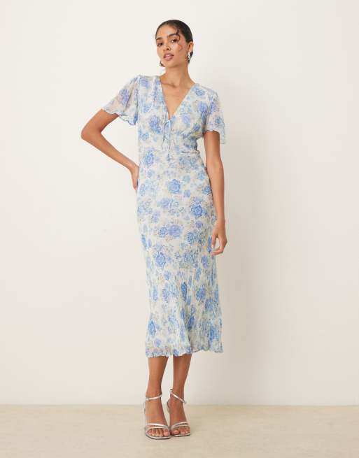 Mango - Robe longueur mollet à imprimé fleuri et manches courtes avec col V à détail noué - Bleu pastel