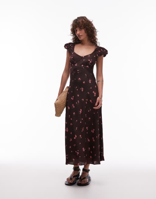 Mango - Robe mi-longue à imprimé fleuri et encolure dégagée - Marron