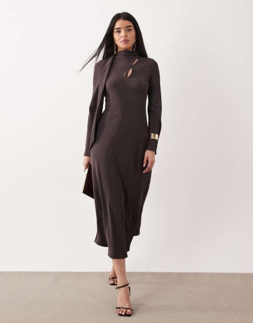 Mango - Robe mi-longue à manches longues et détail foulard - Marron