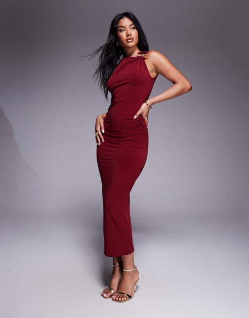 Mango - Robe mi-longue asymétrique près du corps avec détail métallique - Bordeaux