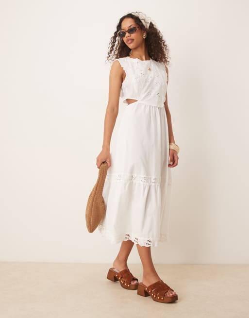 Mango - Robe mi-longue brodée à découpes sur les côtés - Blanc