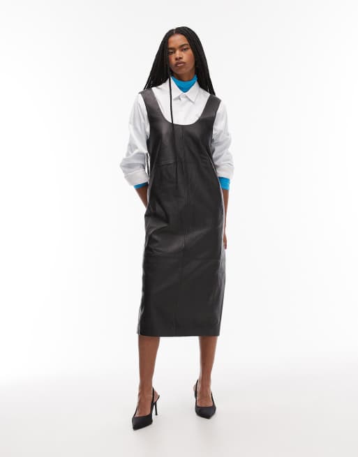 Mango - Robe mi-longue sans manches en cuir à encolure carrée - Noir