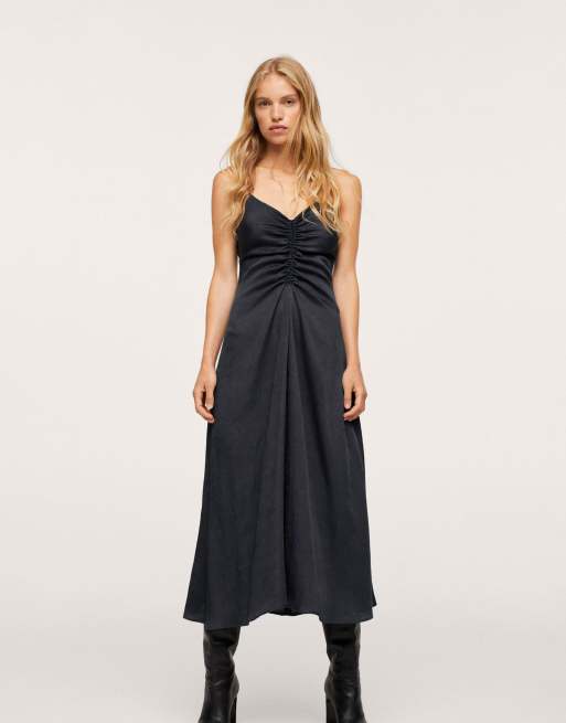 Mango - Robe satinée à bretelles avec fronces - Bleu marine