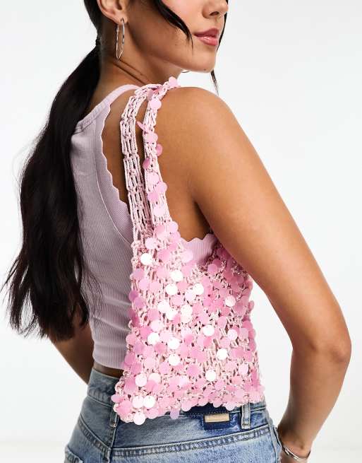Mango - Sac porté épaule au crochet et à sequins - Rose