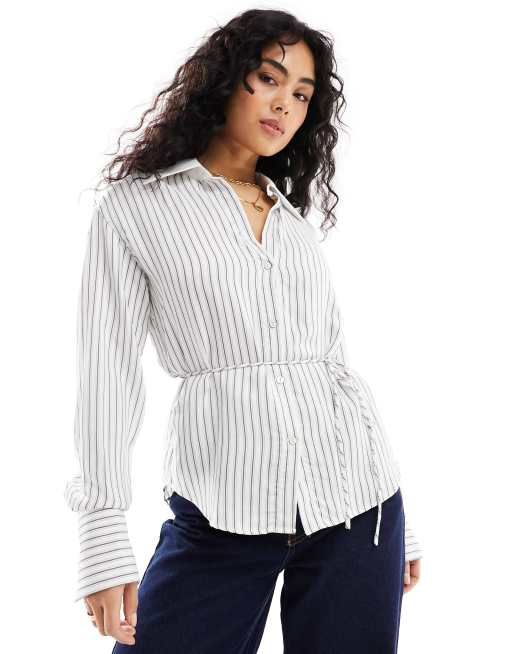 Mango - Top à col contrasté et fines rayures - Blanc cassé
