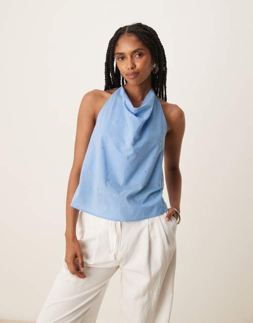 Mango - Top dos avec col bénitier et strass thermocollés - Bleu