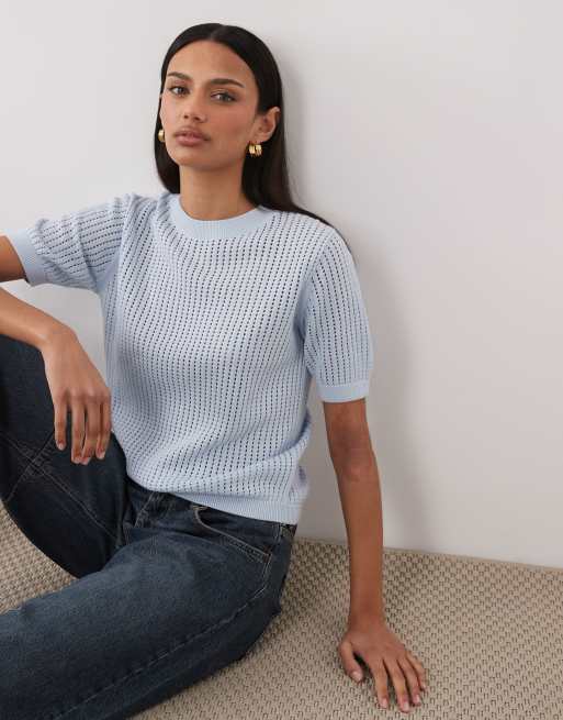 Mango - Top en maille 100 % coton à manches courtes - Bleu pastel