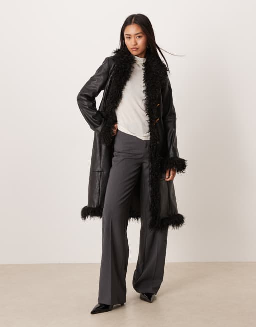 Mango - Veste longue en similicuir à bordures pelucheuses contrastantes - Noir