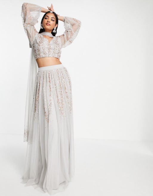 Maya - Jupe lehenga longue à ornements sur l'ensemble - Gris