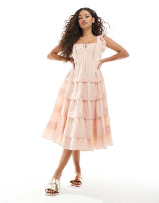 Miss Selfridge Petite - Robe babydoll mi-longue bordée de dentelle en broderie anglaise - Pêche