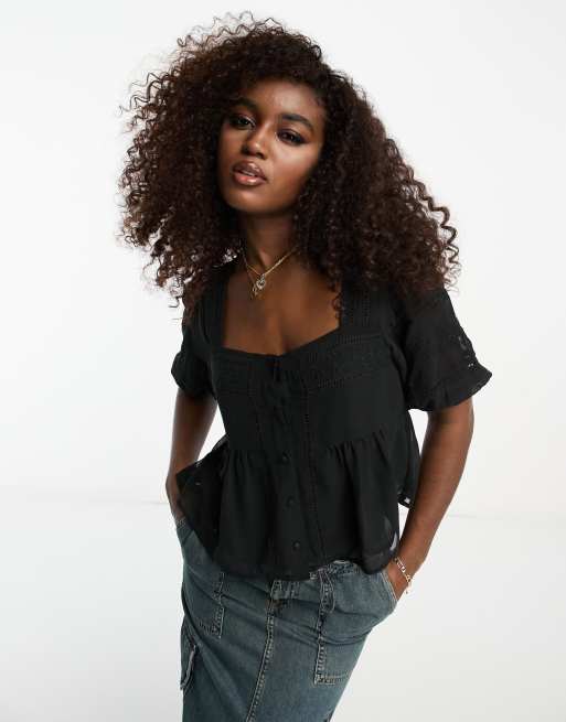 Miss Selfridge - Blouse en mousseline avec empiècements en dentelle et détails brodés - Noir
