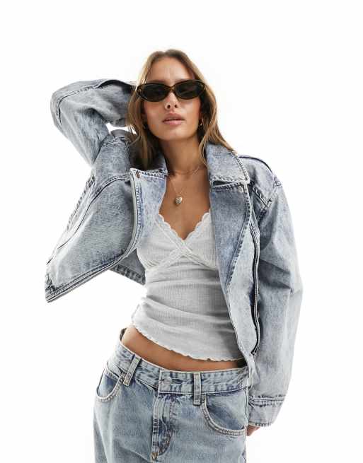 Miss Selfridge - Blouson style motard court en jean - Bleu délavé